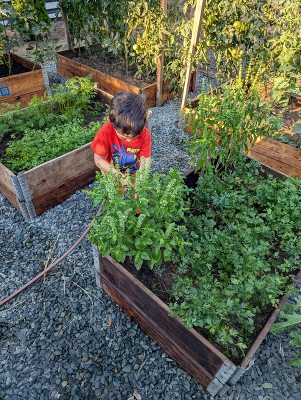 My child loves getting involved in our regular chores—he helps us plant in the garden, water the plants, and even has his own set of gardening tools. He spends a lot of time outside playing in the sand or riding his bike. He gets excited every time we harvest something from our garden. He has learned so much from the process of growing your own food, and he even helps me cook and clean.